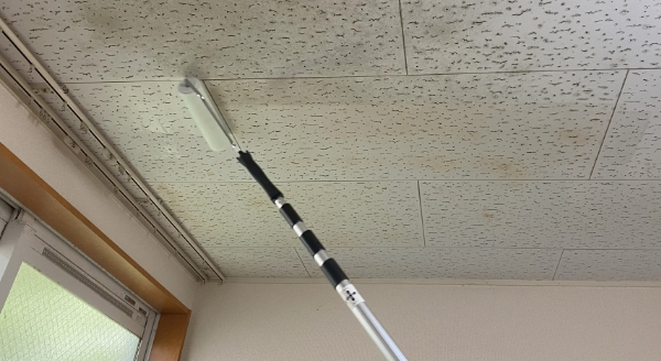 換気不良が原因で天井裏まで繁殖している場合は、天井材を外して除去・防カビ処理を行う。